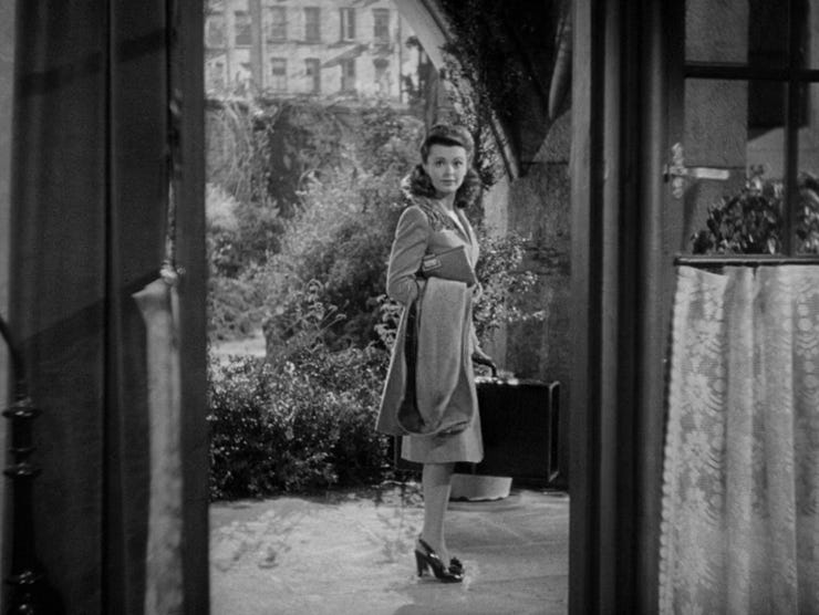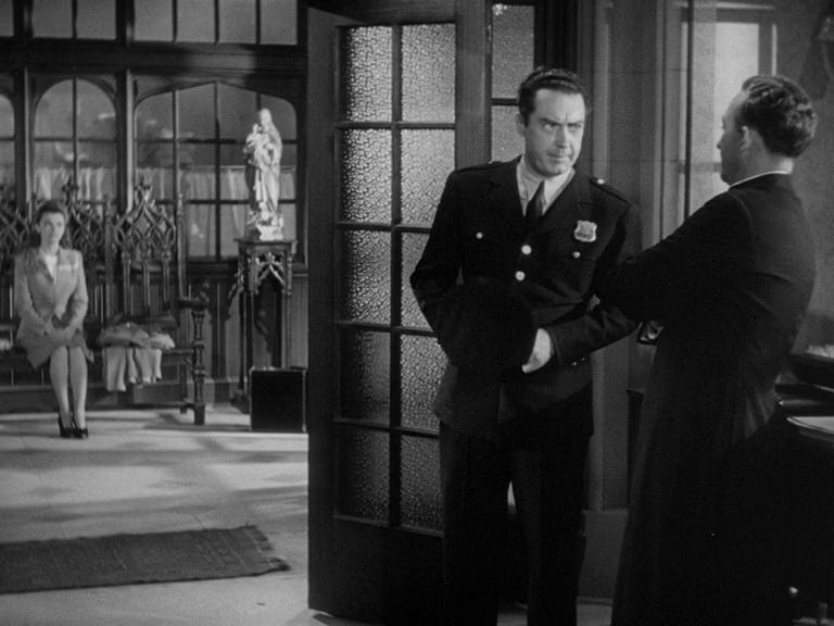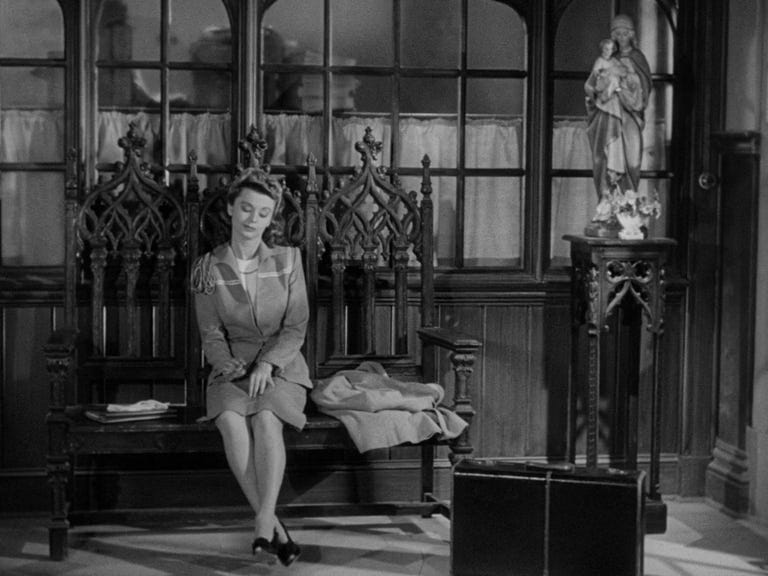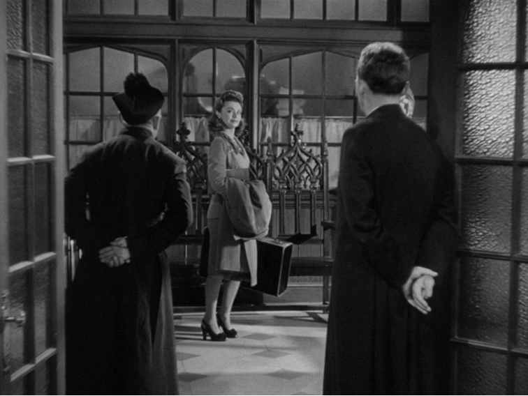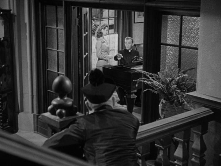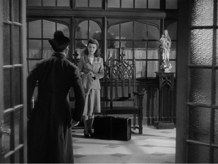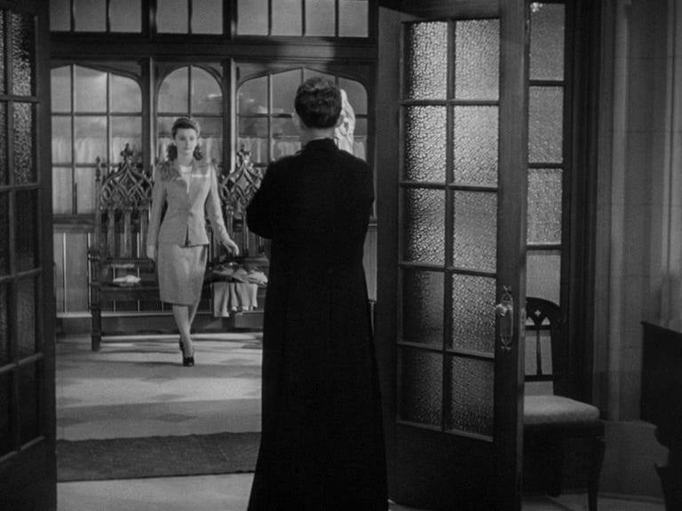 Look here at how McCarey follows the most classical rules and yet finds possibility within them. McCarthy informs O'Malley that Carol has run away from home and refuses to go back. The center-framing of Crosby is then offset by his curious peek over to the young woman in the other room. The film cuts to a wide-shot of her. Completely logical, this is O'Malley’s POV, but in cinema, all perspectives and subjectivities are invented, so the already chosen positioning of the actors and spatial arrangement allows for this simple POV shot to beautifully frame Carol in the space, alone in wide-shot, alienated by the ornate Catholic décor, her packed suitcase in view.