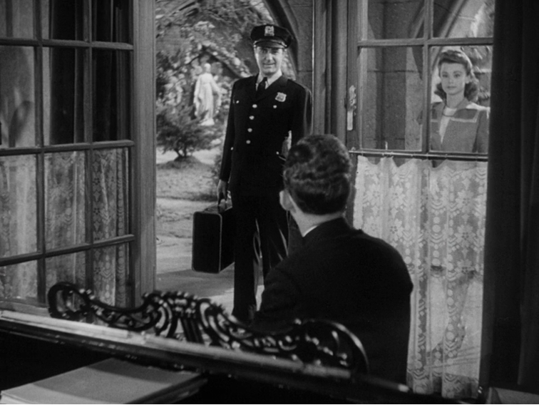 Officer McCarthy (Tom Dillon) pays a visit to Father O'Malley (Bing Crosby). He has brought a stranger along with him named Carol (Jean Heather). Right away we see that the door is wide open for McCarthy, but not necessarily for Carol, framed and obscured by the window pane.
